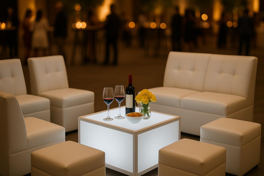 Mobiliario lounge premium que transforma cualquier área en un espacio exclusivo para ejecutivos y clientes VIP. Sillones y mesas tipo sala que crean el ambiente perfecto para conversaciones de negocios, networking estratégico y reuniones informales durante sus eventos corporativos.
